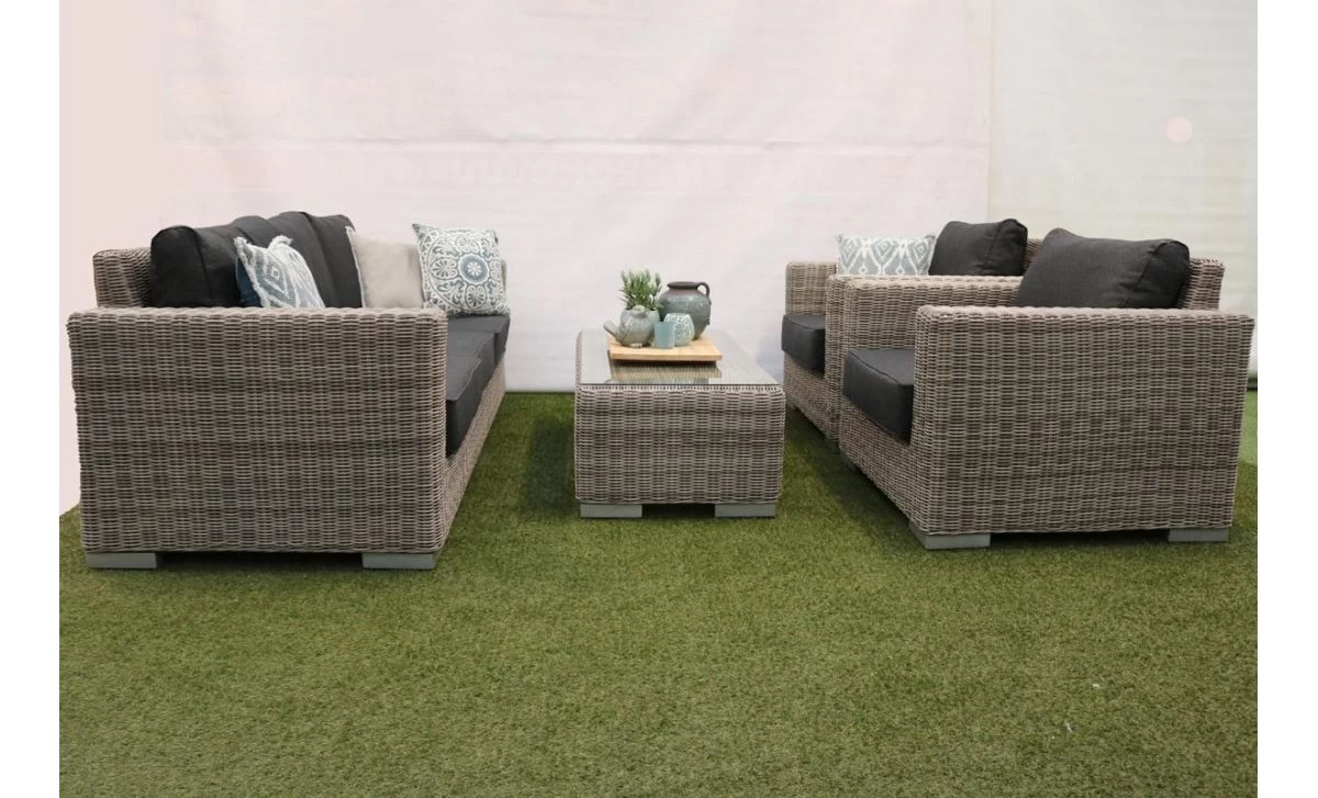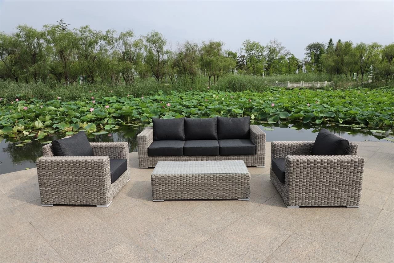 Het binnenframe van de Catania tuinset is gemaakt van aluminium. Hierdoor roest de set niet en zijn de meubels lekker licht van gewicht. Om het frame is kunststof wicker draad gevlochten. Dankzij de grijzen kleur heeft de set een moderne en tegelijkertijd klassieke uitstraling.
