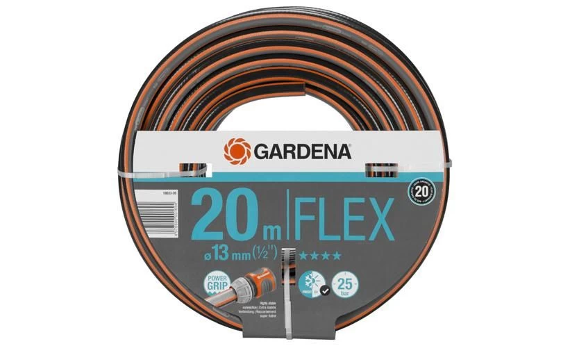 De GARDENA Comfort FLEX slang met Power Grip profiel staat garant voor de perfecte verbinding tussen slang en slangstuk. Dankzij de nieuwe technologie, grijpen ze in elkaar als tandwielen. Het Power Grip profiel vervult de wens van veel tuinbezitters: een betrouwbare verbinding met optimaal houvast. Een positief neveneffect van het verhoogde profiel: De slang is makkelijker op te rollen en glijdt goed. Dankzij het spiraalweefsel textiel met twee spiralen die werken in tegengestelde richtingen, is de slang drukbestendig en vormvast, maar ook flexibel en gemakkelijk te hanteren. Raakt niet in de knoop en verdraait niet. Dit zijn de beste voorwaarden voor een comfortabel en flexibel gebruik in uw tuin. Indien gewenst, systematisch uit te breiden met Original GARDENA System koppelstukken en besproeiingsproducten. De slang is vrij van schadelijke weekmakers (ftalaten ) en zware metalen, en is natuurlijk UV-bestendig. De dikke wanden maken de slang bijzonder robuust en duurzaam. Barstdruk: 25 bar. Garantie: 20 jaar.