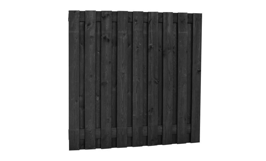 Gemaakt van 17 planken en 2 tussenplanken. Planken 1,5×14 cm. Geïmpregneerd en Zwart gedompeld. Gedompeld hout is niet dekkend-zwart, de kleur van het hout kan doorschijnen. Desgewenst nabehandelen.