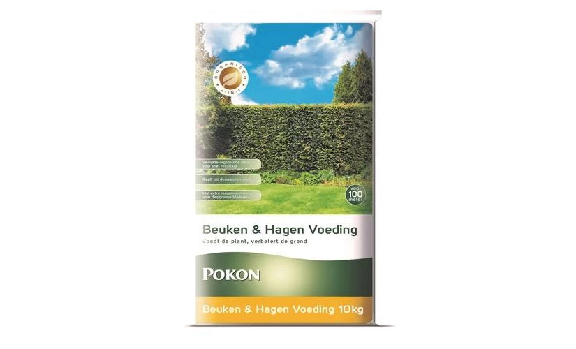 3-in-1 werking: voeding, bodemverbeteraar en plantversterker in 1 korrel. Pokon Beuken & Hagen Mest is geschikt voor vrijwel alle soorten hagen. Deze organische mest, verrijkt met in de natuur voorkomende mineralen zoals zeoliet en algen, voedt de plant en verbetert de grond. Een goed bemeste en gezonde bodem is een belangrijke voorwaarde voor mooie, gezonde haag. Door de extra toevoeging van Magnesium (Mg0) en IJzer (Fe) krijgen de bladeren een diepgroene kleur. De voeding en Pokon Plantenversterker zorgen voor sterke planten met een goede weerstand tegen ziektes, plagen en vorst. Pokon Beuken & Hagen Mest geeft tot wel 120 dagen voeding. Pokon Beuken & Hagen Mest kan in de maanden maart t/m augustus gebruikt worden. Voor het beste resultaat voed je je planten 2 keer per jaar, in het vroege voorjaar en in de zomer.